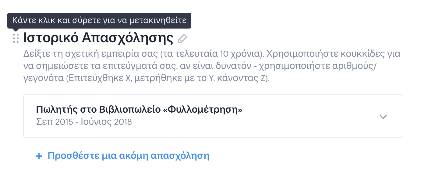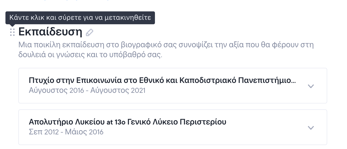 Αναδιάταξη τμημάτων*: Κάθε τμήμα κάτω από την επαγγελματική σύνοψη, στην κυρίως στήλη του βιογραφικού, μπορεί να αναδιαταχθεί. Για να αναδιατάξετε ένα τμήμα, πατήστε το εικονίδιο πλέγματος στα αριστερά του τμήματος, όπως φαίνεται παρακάτω. Στη συνέχεια, μπορείτε να σύρετε το τμήμα προς τα πάνω ή κάτω. Δείτε τα παρακάτ�� στιγμιότυπα οθόνης.