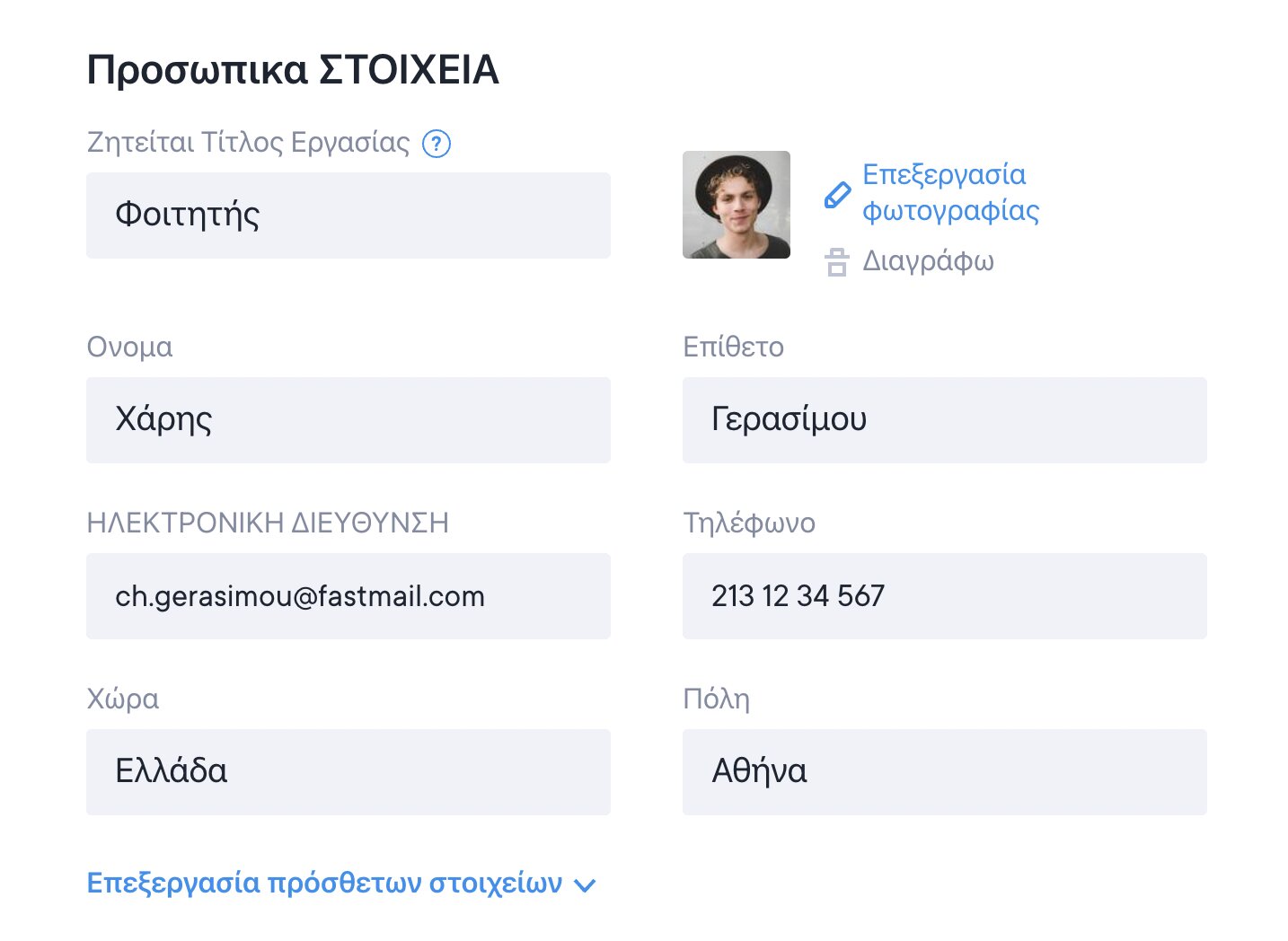 Για να προσθέσετε φωτογραφία στο βιογραφικό σας, εισέλθετε στον λογαριασμό σας και πατήστε το βιογραφικό σας, για να το επεξεργαστείτε. Εκεί, πατήστε στο πρώτο τμήμα, που ονομάζεται «Προσωπικά στοιχεία».